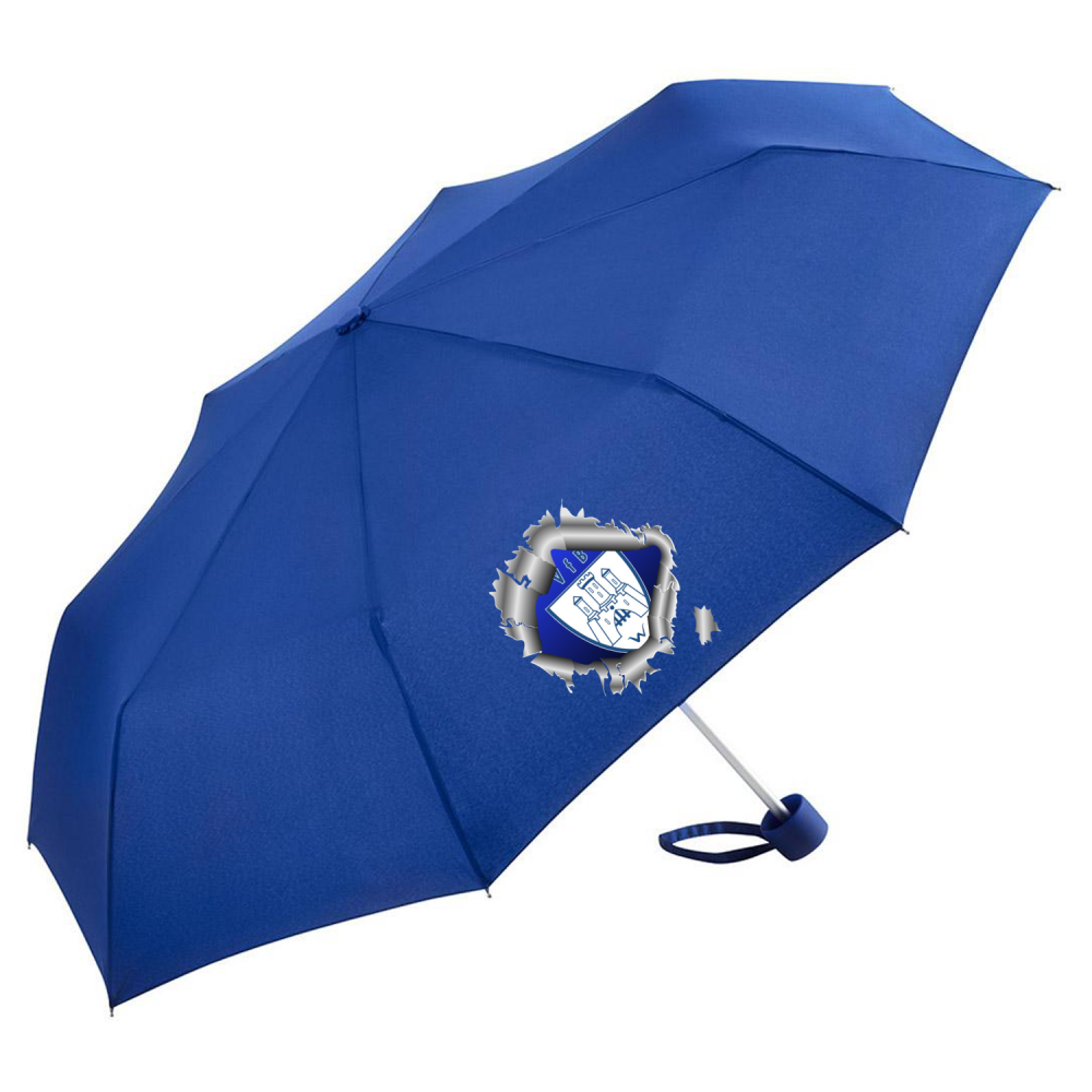 Auf schlechte Witterung immer gut vorbereitet: Mit dem praktischen Taschenschirm im trendigen Look. Mit seinem praktischen Griff lässt er sich gut und sicher halten. Der Schirm ist leicht aufzuspannen und lässt sich genauso unkompliziert zusammenklappen. Geöffnet besitzt er eine schöne Größe und zeigt den Vereinsprint. Die Gestellkonstruktion zeigt sich robust. In geschlossenem Zustand wird er fixiert und passt in jede Tasche. Hübsch und zweckmäßig: der praktische öffnet & schließt per Knopfdruck (am Griff). Ein absolutes Must-Have.